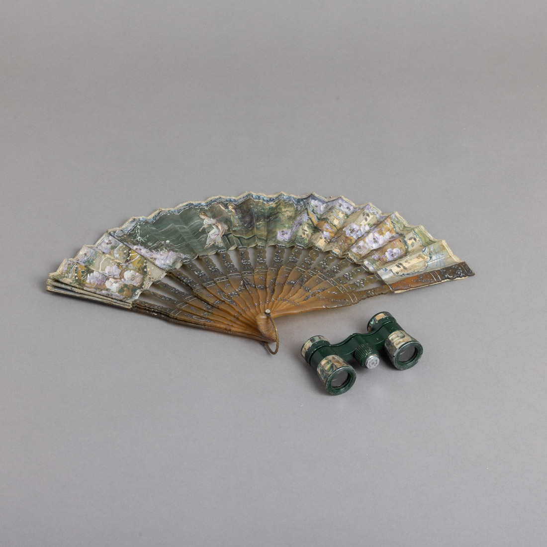 Leque com aba em seda pintada "paisagem com figuras e flores", binóculos em metal revestido a madrepérola. Europa, Séc. XIX/XX. Sinais de uso e pequenos defeitos.