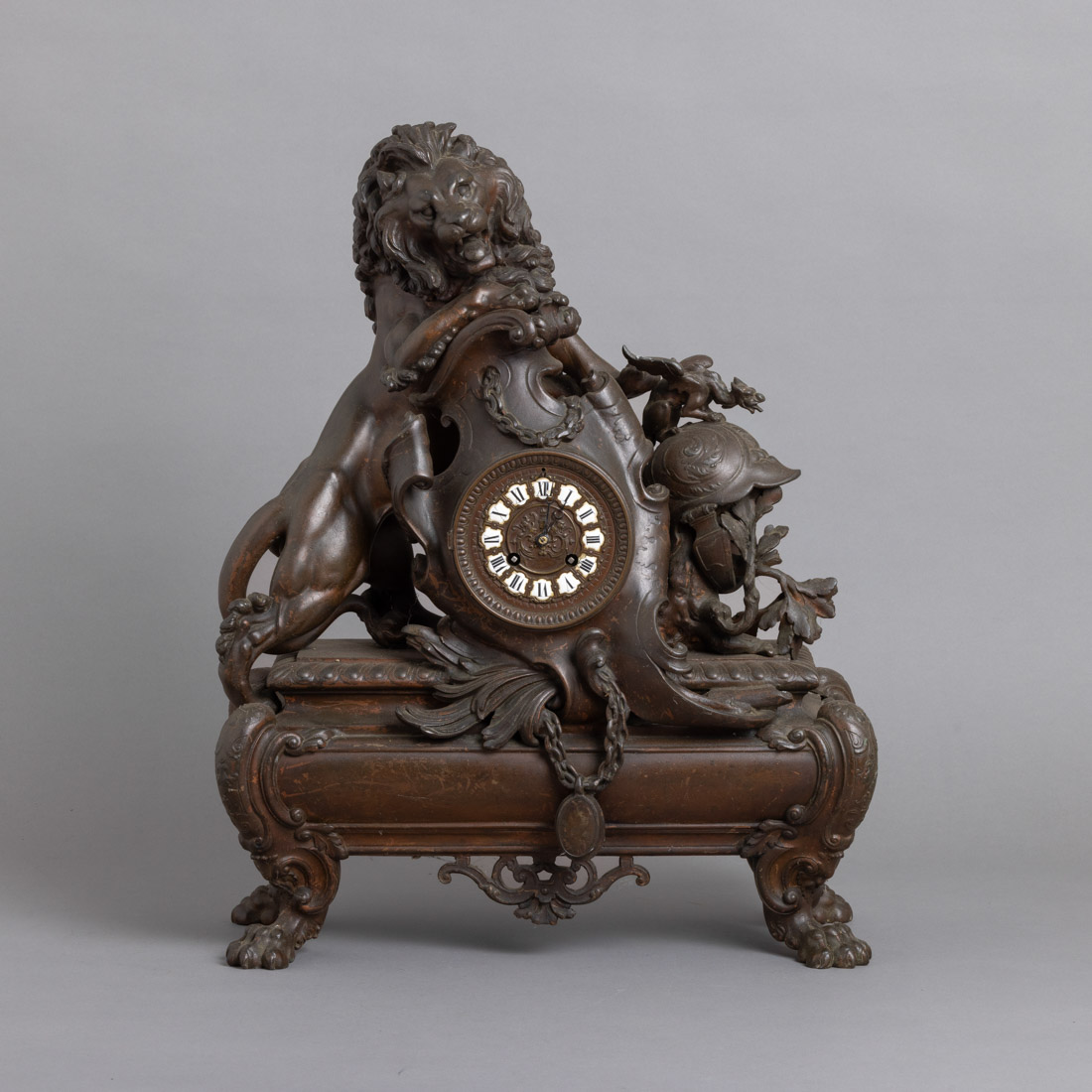 Em bronze, com decoração relevada "Leão", mostrador com numeração romana a esmalte branco. Em marcha, com pêndulo e sem chave. Sinais de uso, pequenos defeito e em falta vidro do mostrador e tampa da parte de trás.