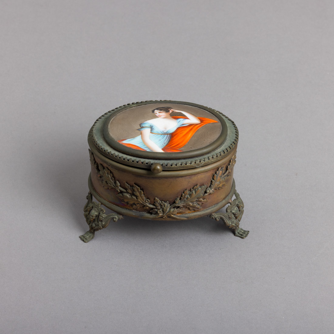 Em metal relevado e vazado, na tampa placa em porcelana, decoração policromada "Josefina Bonaparte" segundo a obra de Pierre-Paul Prud'hon. Sinais de uso, pequenos defeitos e oxidações.
