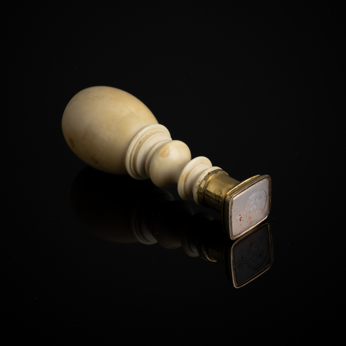 Mão em marfim torneado, cunho em ouro baixo e ágata gravada com brasão de família irlandesa "Mac Namara". Séc. XVII/XVIII. Sinais de uso e pequenos defeitos.