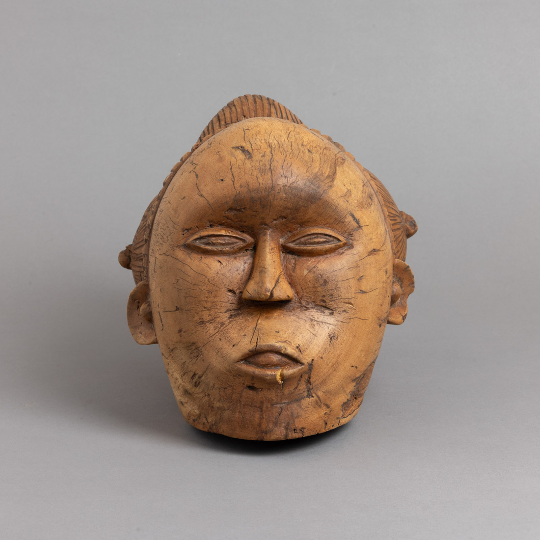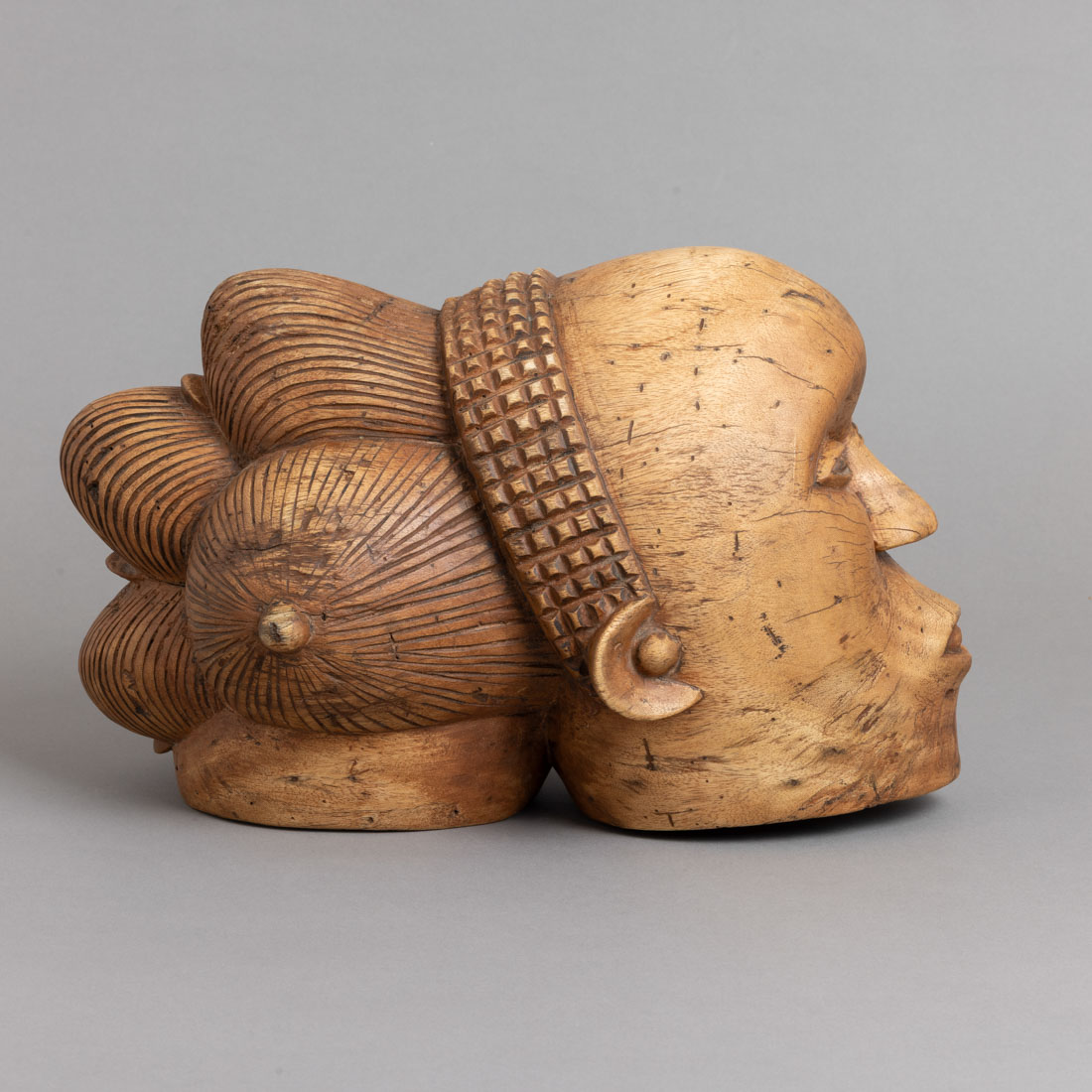 Raro objeto cerimonial, em madeira entalhada, representando cabeças, receptáculos na parte inferior. A maioria destas taças provém dos Kanyok e de grupos aparentados da região centro-ocidental do território Luba, na região de Kalundwe, Congo.
