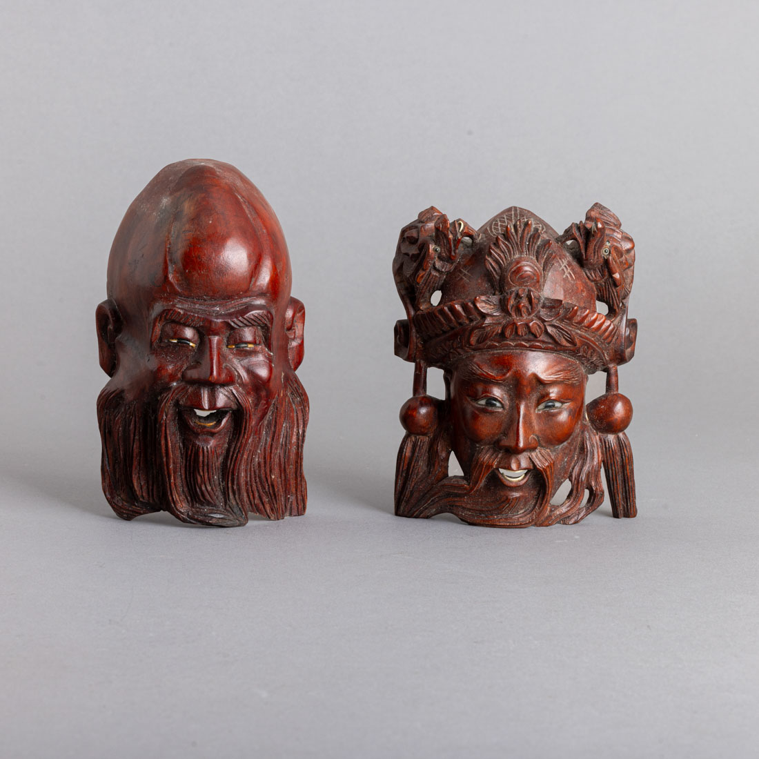Em madeira exótica entalhada, olhos em esmalte vidrado. Sinais de uso.