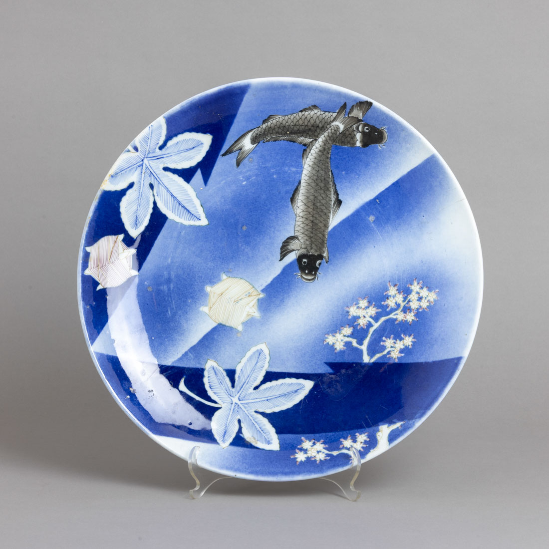 Em porcelana do Japão, período Meiji, decoração policromada "elementos vegetalistas e carpas". Sinais de uso, cabelo e pequenos defeitos de fabrico.