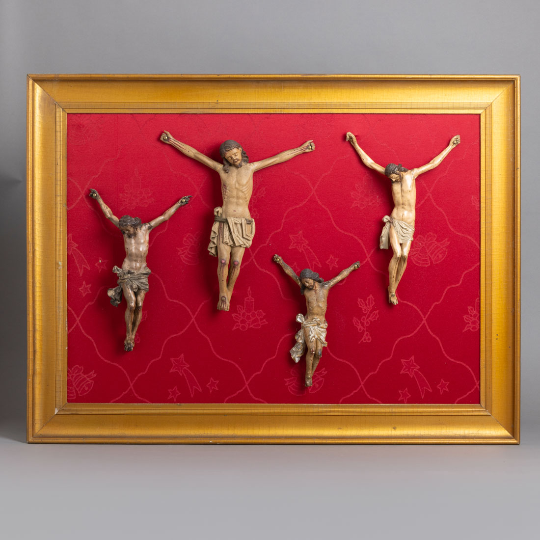 Esculturas em madeira policromada e um em metal, fundo em tecido vermelho. Pequenas falhas e pequenos defeitos