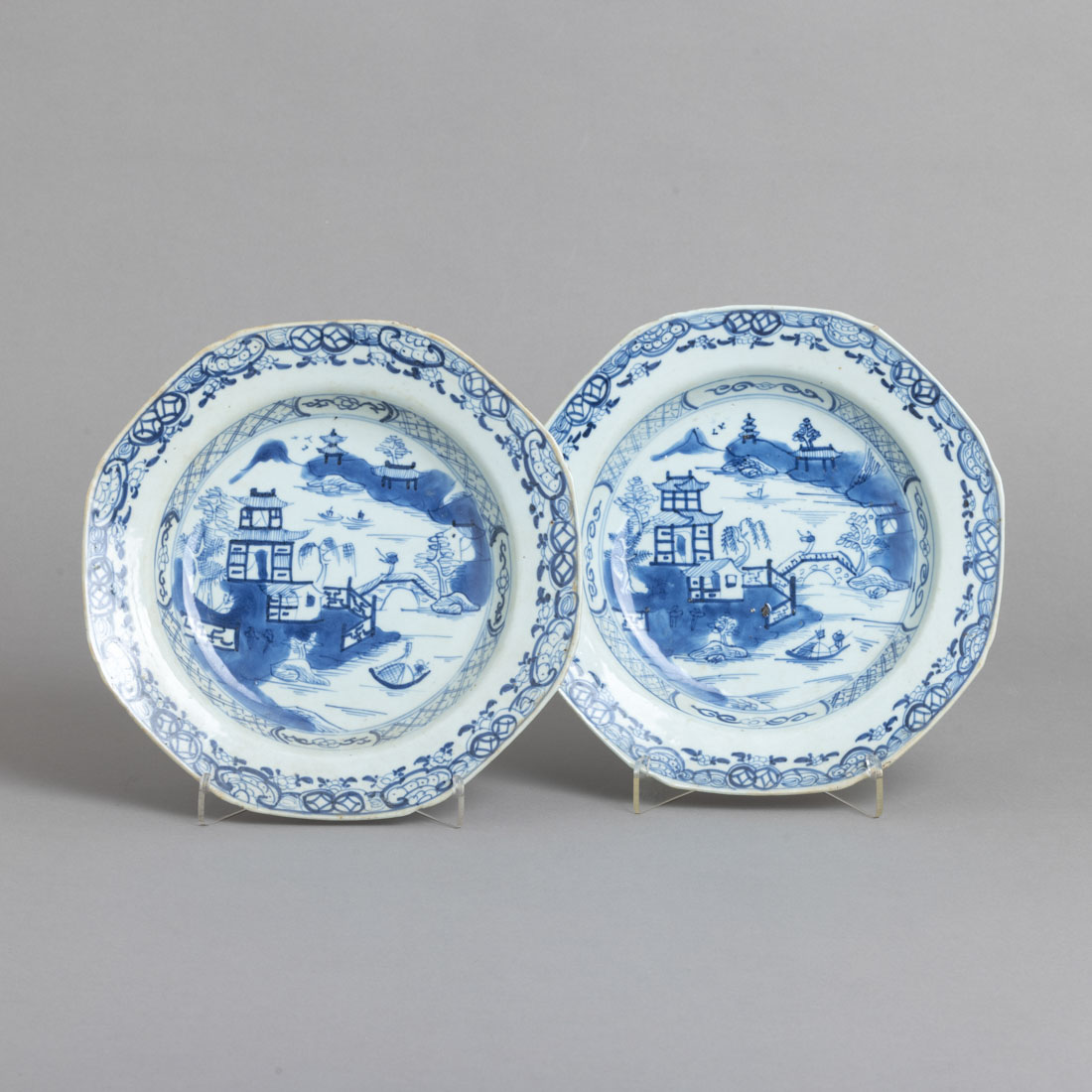 Em porcelana da China, Séc. XVIII/XIX, decoração a azul "paisagens com pagodes". Sinais de uso, pequeno defeito de fabrico e pequenas falhas no vidrado do bordo.