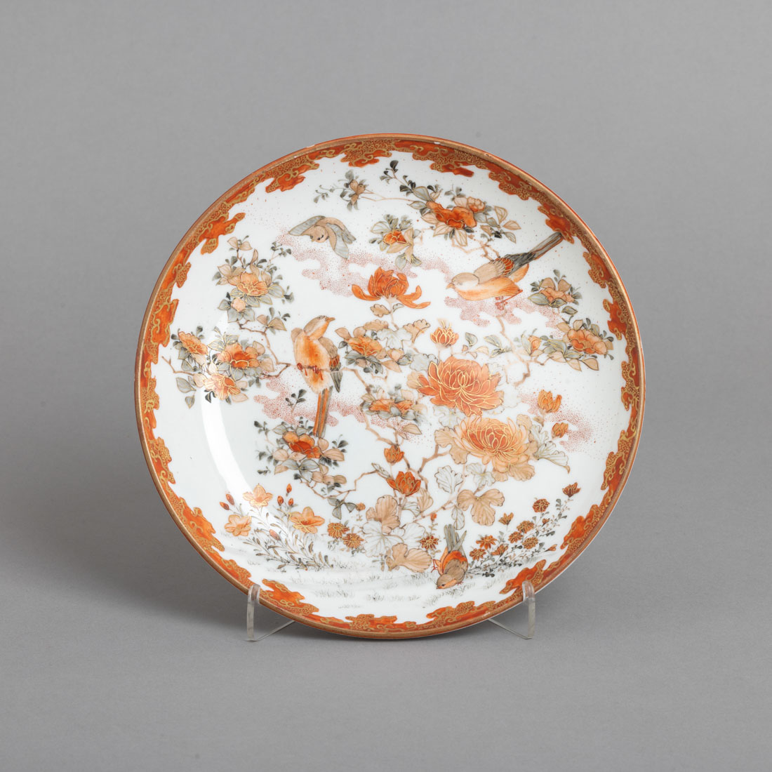 Em porcelana do Japão, decoração policromada e dourada "flores e aves", verso decorado a rouge de fer. Marcado. Sinais de uso, ínfima esbeiçadela e cabelos na base.