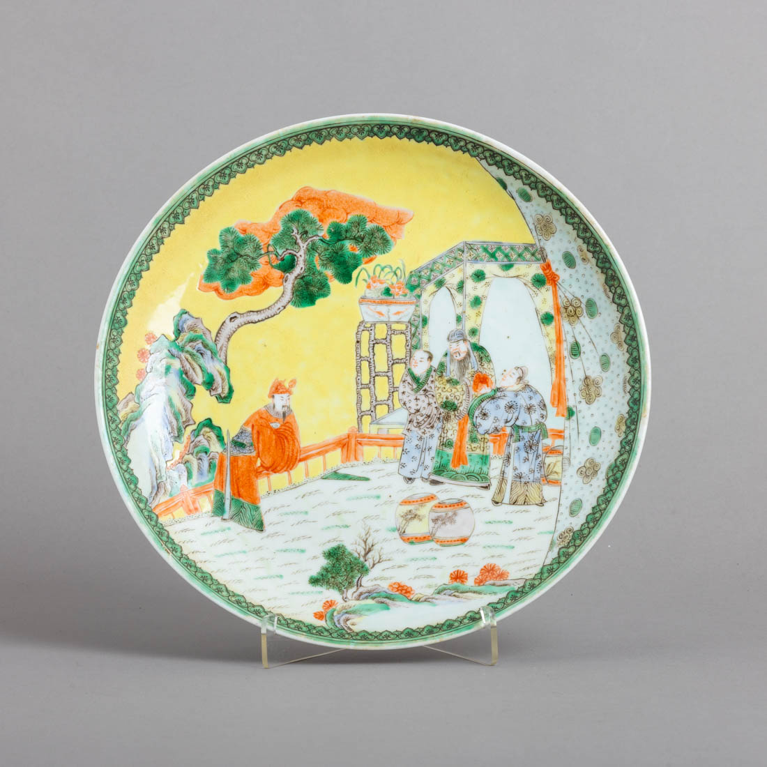 Em porcelana da China, decoração policromada com esmaltes da família verde "paisagem com figuras". Marcada. Sinais de uso e pequena esbeiçadela.