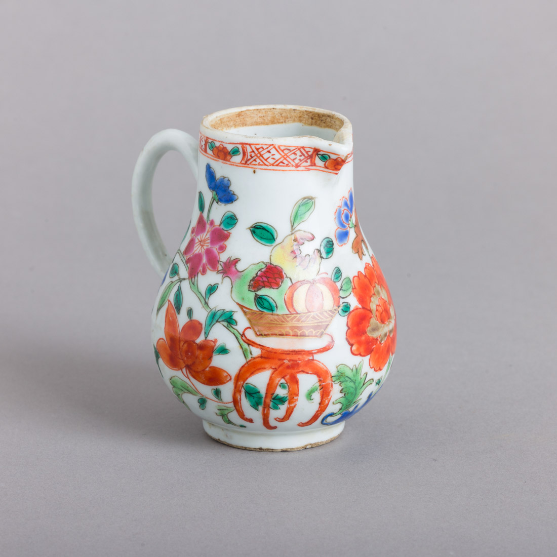 Em porcelana da China Companhia das Índias, Séc. XVIII, decoração policromada e dourada com esmaltes da família rosa "flores e frutos". Sinais de uso.