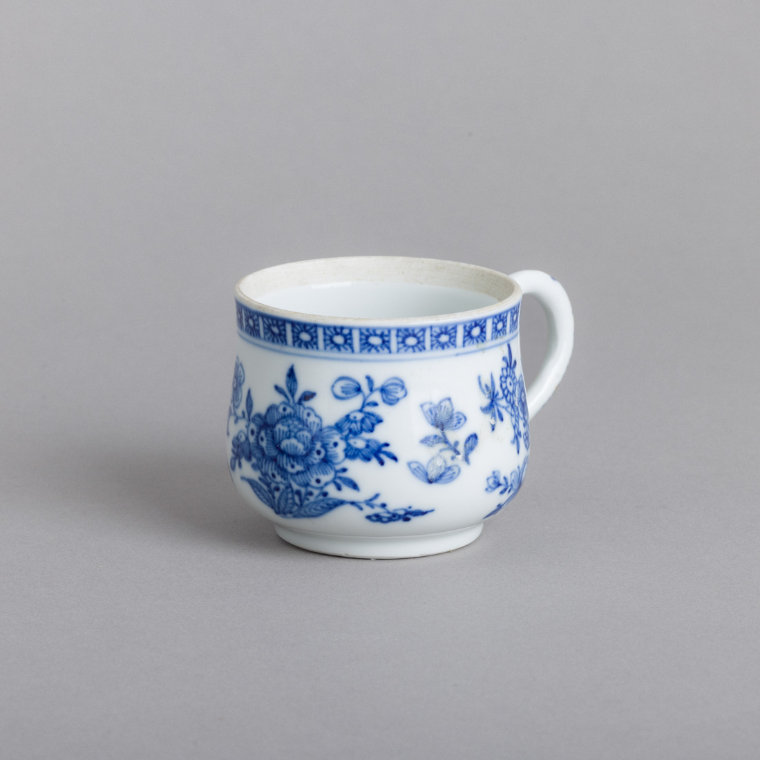 Em porcelana da China, Séc. XVIII, decoração a azul "flores". Sinais de uso, pequena falha na ponta da pega e falta tampa.