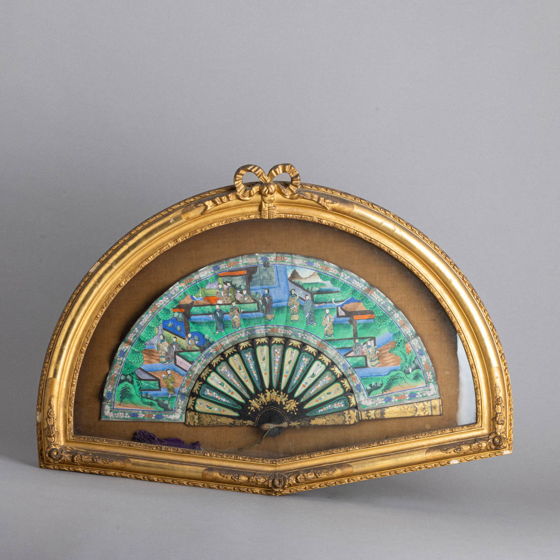 Varetas em xarão lacado a negro com dourados "figuras", aplicações pintadas "flores e pássaros", aba em papel pintado "Figuras em cenas do quotidiano" aplicações em osso. China, Séc. XIX. Emoldurado. Sinais de uso e pequenos defeitos. Dim. Total: 50x72 cm