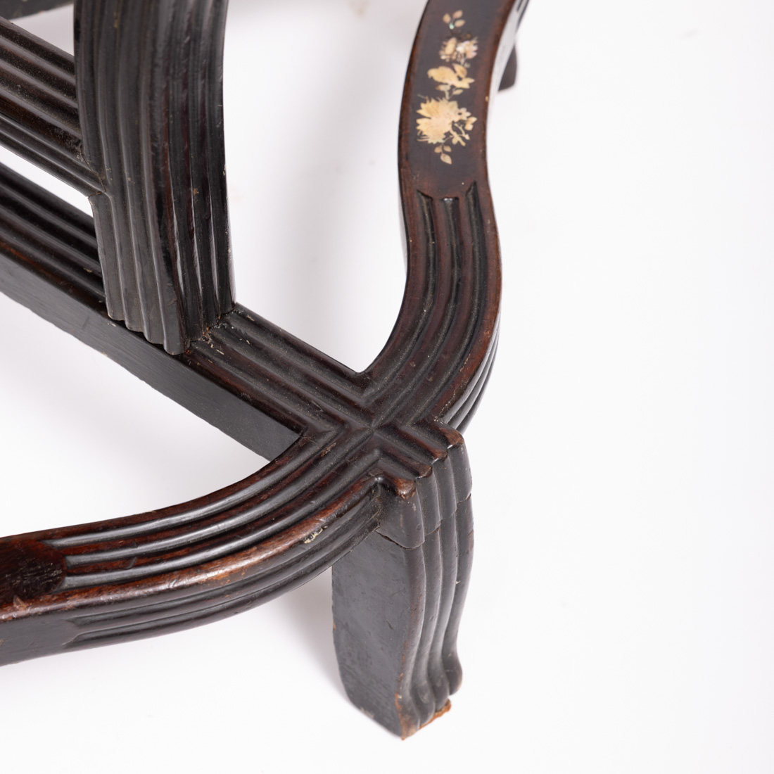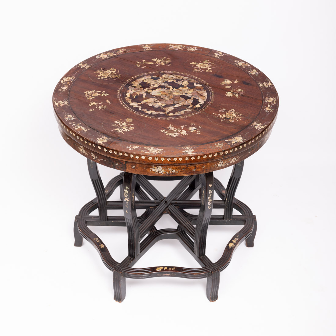 Em tamarindo, tampo redondo com embutidos em madrepérola "dragão e flores", travejamento e pernas canelados. Sinais de uso, algumas falhas e fissuras.
