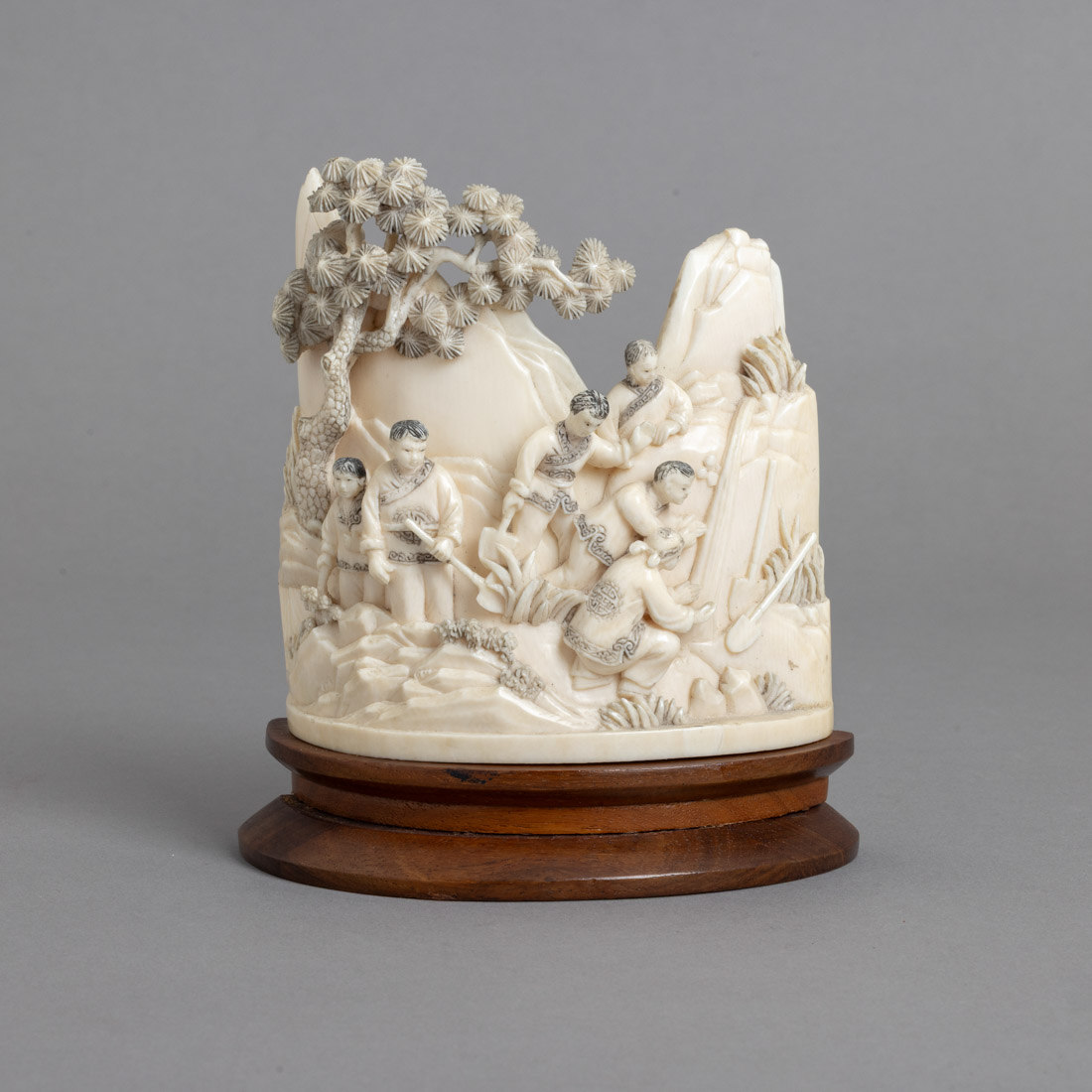 Grupo escultórico em marfim, parcialmente pintado. China. Base em madeira. Pequenos defeitos.