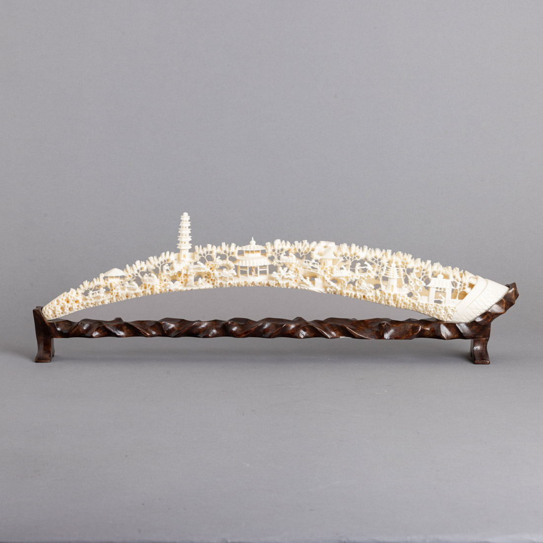 Em marfim minuciosamente esculpido e vazado, base em madeira. China, Séc. XX. Ínfimas falhas.