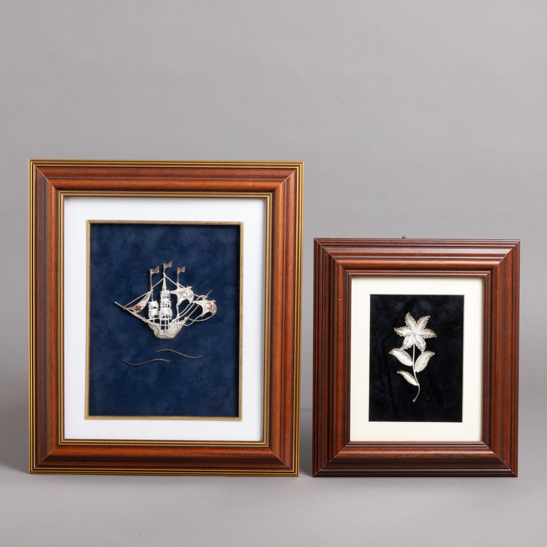 Em prata e filigrana de prata portuguesa, caravela decorada com esmaltes policromados. Emoldurados. Sem marcas, ao abrigo do Decreto-Lei n.º 120/2017. Sinais de uso.