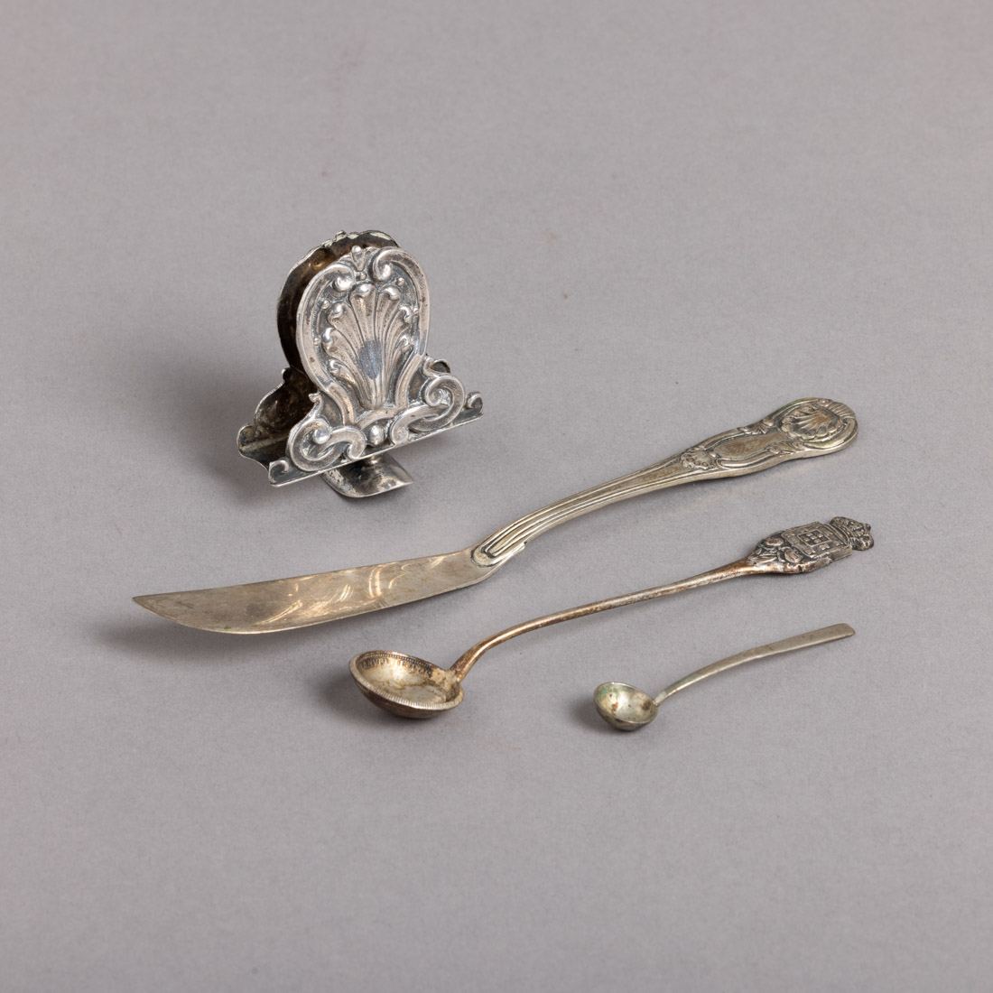 619. DUAS COLHERES, FACA DE MANTEIGA E CLIP PARA CIGARRO