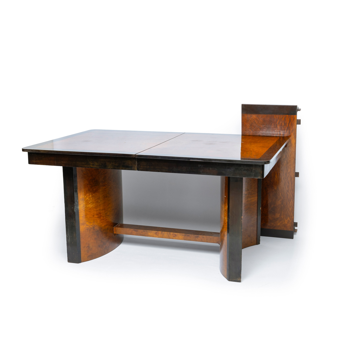 Folheada a raiz de nogueira e pau santo, cadeiras com assento estofado a tecido, mesa com uma tábua de extensão. Sinais de uso, falhas e defeitos.