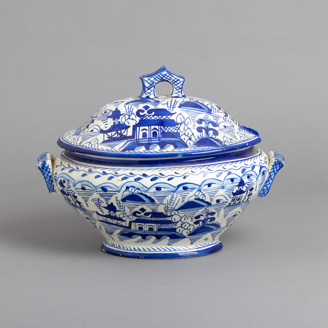 Em faiança portuguesa, decoração a azul "paisagem oriental", pomo e pegas relevadas. Séc. XX. Sinais de uso e algum desgaste no vidrado.
