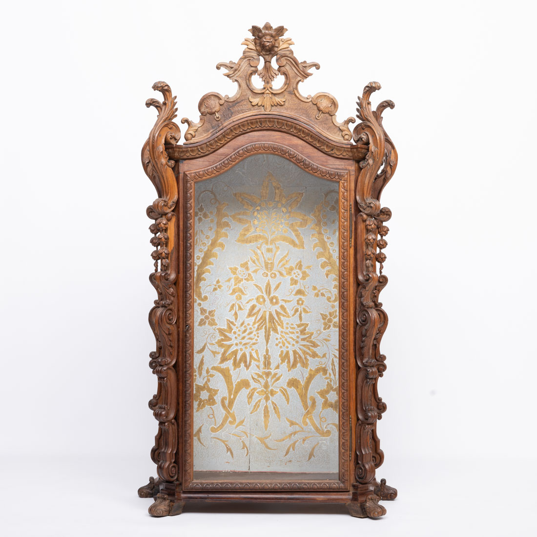 Estilo D. José, em pau santo com entalhamentos, cimalha recortada e vazada, interior pintado e dourada "flores", porta e laterais em vidro. Séc. XIX. Sinais de uso e pequenos defeitos.