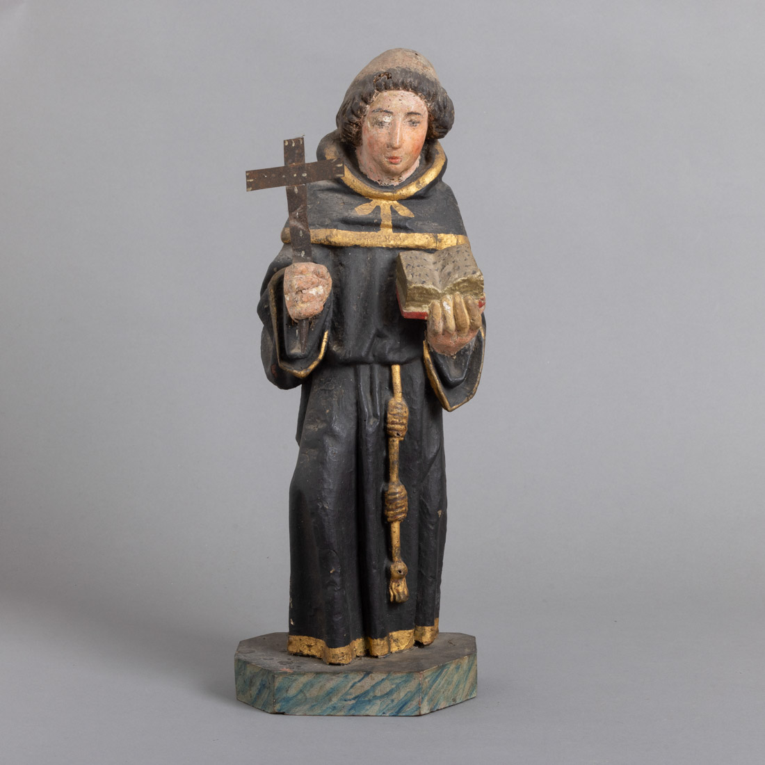 Escultura em madeira policromada e dourada. Falhas, pequenos defeitos e vestígios de xilófagos.