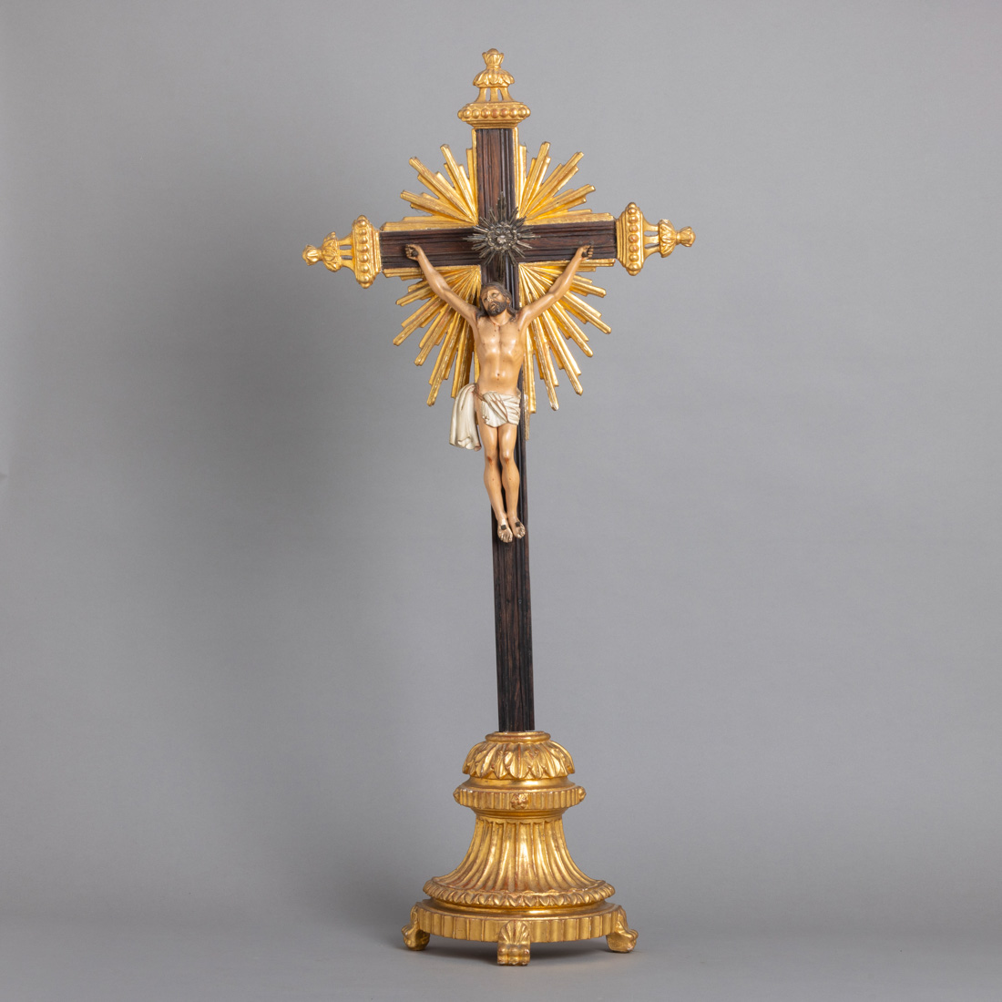 Cruz em pau santo, remates e base em medeira entalhada e dourada, escultura em madeira policromada, olhos de vidro, resplendor em prata portuguesa, Séc. XIX, marca de ensaiador do Porto. Pequenas falhas e colagens.