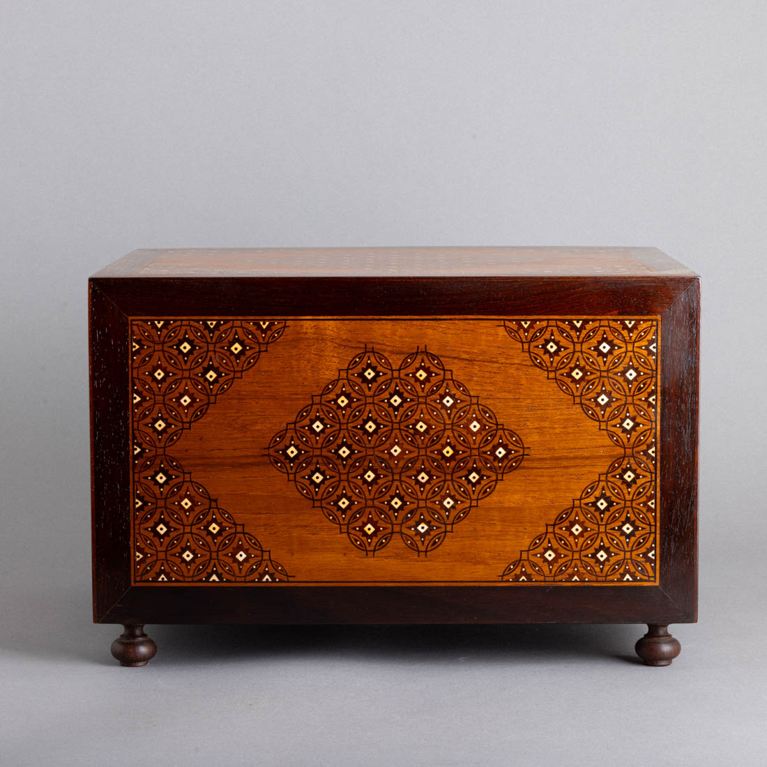 Em teca e pau santo, com micromosaico "sadeli" em marfim e outras madeiras, duas gavetas inferiores e uma superior com vários compartimentos. Pés torneados. Ferragens em metal amarelo. Sinais de uso e pequenos defeitos.