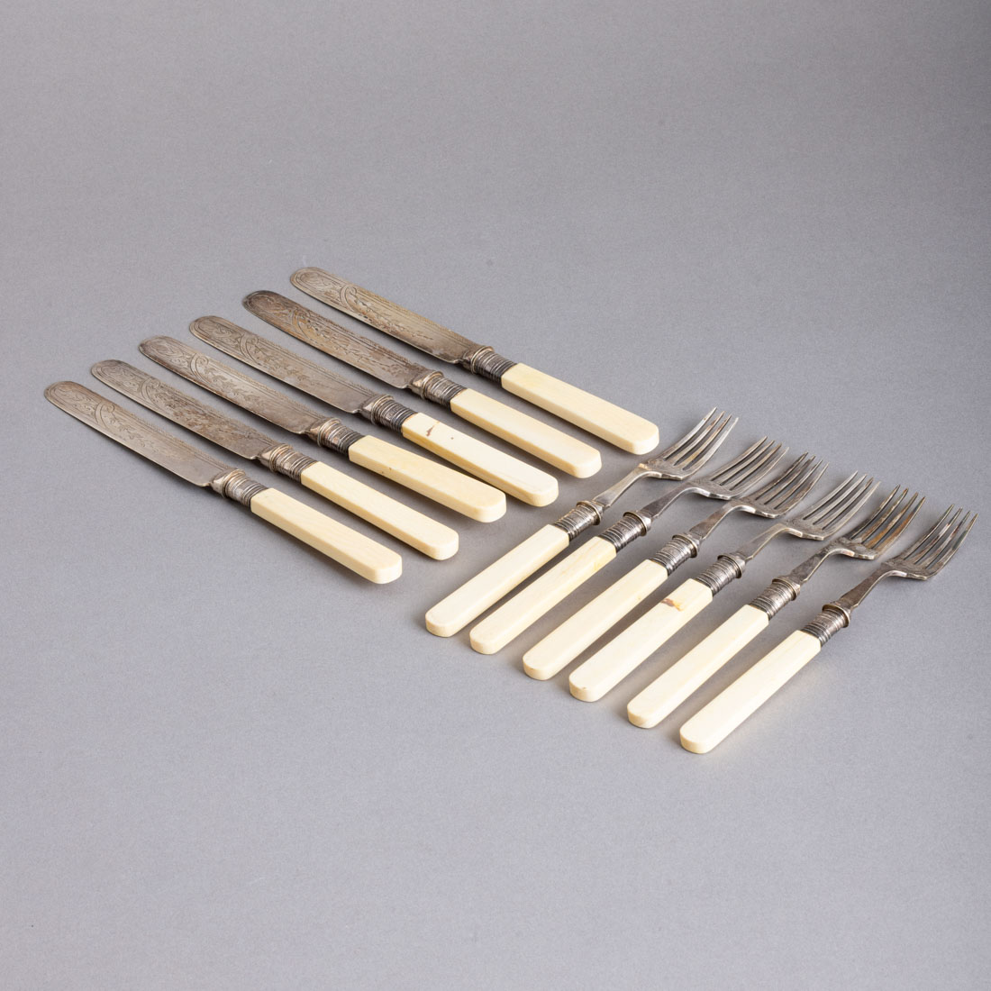 Em metal prateado, decoração gravada "elementos vegetalistas", anilhas em prata inglesa, marcas de garantia da cidade de Sheffield, cabos em massa. Sem marcas portuguesas, ao abrigo do Decreto-Lei n.º 120/2017. Sinais de uso, leve oxidação e ligeiras fissuras nos cabos.