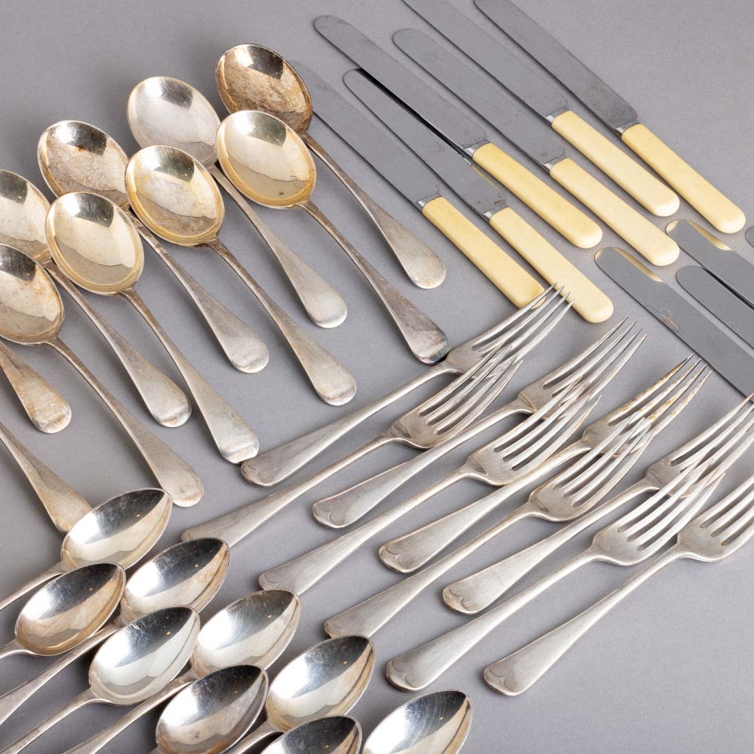 Em metal prateado e aço inoxidável, decoração lisa e relevada, facas com cabos em massa, composto por talheres de carne e dois conjuntos de colheres de sopa. Sinais de uso e oxidação.