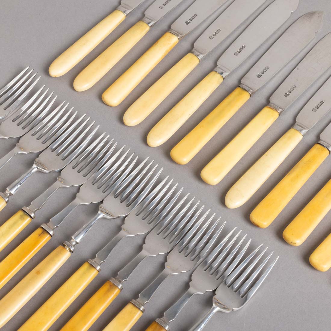 Em prata inglesa de 925, com cabos em osso, metade com marcas de garantia da cidade de Sheffield, 1918 e de ourives Cooper Brothers & Sons, a outra metade com marcas de Sheffield, 1919, e de ourives George William & Percy Shirtcliffe. Sinais de uso, alguns cabos deslocados e com fissuras.