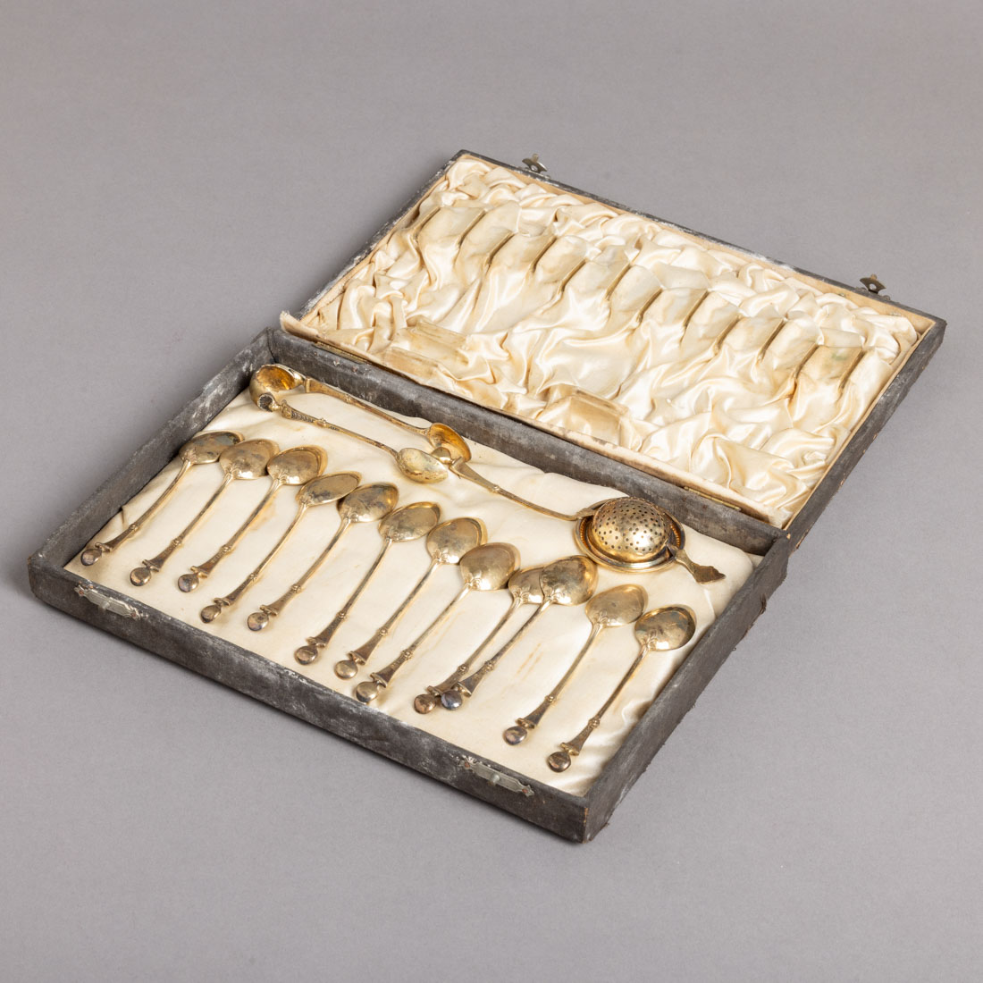 723. CONJUNTO DE DOZE COLHERES DE CHÁ, COADOR E PINÇA DE AÇÚCAR