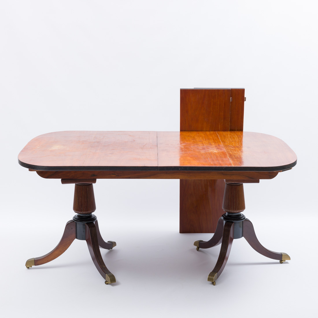 Em diferentes madeiras, de dupla coluna torneada e pés com terminais em metal amarelo e rodízios. Com duas tábuas de extensão. Sinais de uso e defeitos no tampo.