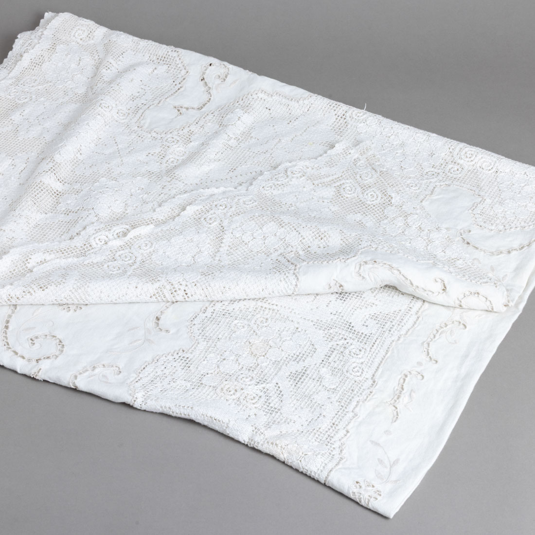 Em linho bordado e renda manual. Sinais de uso e pequenos defeitos.