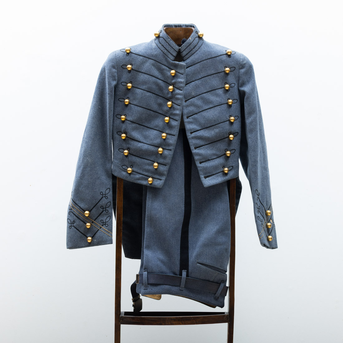 Em tecido com botões em metal amarelo, composto por casaco e calças. Sinais de uso e algumas falhas.
