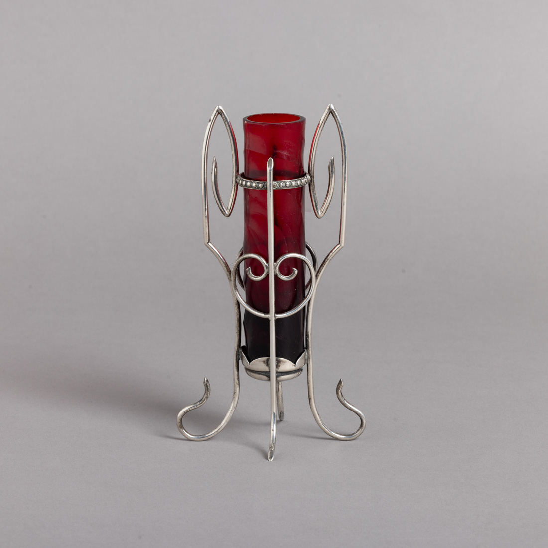 Em prata portuguesa contraste javali (1887-1937) de 833, decoração relevada friso de perlados, alma em vidro vermelho. Sinais de uso e uma das pernas soltas.