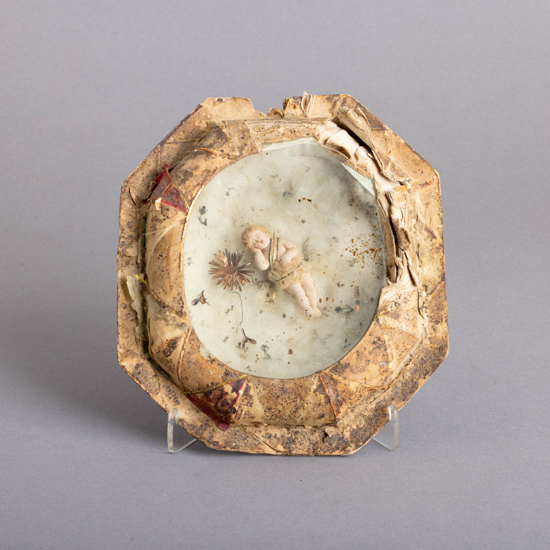 Escultura em cera pintada e outros materiais. Séc. XIX. Falhas e defeitos.