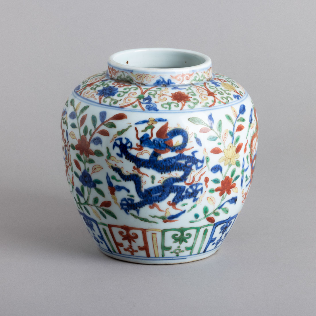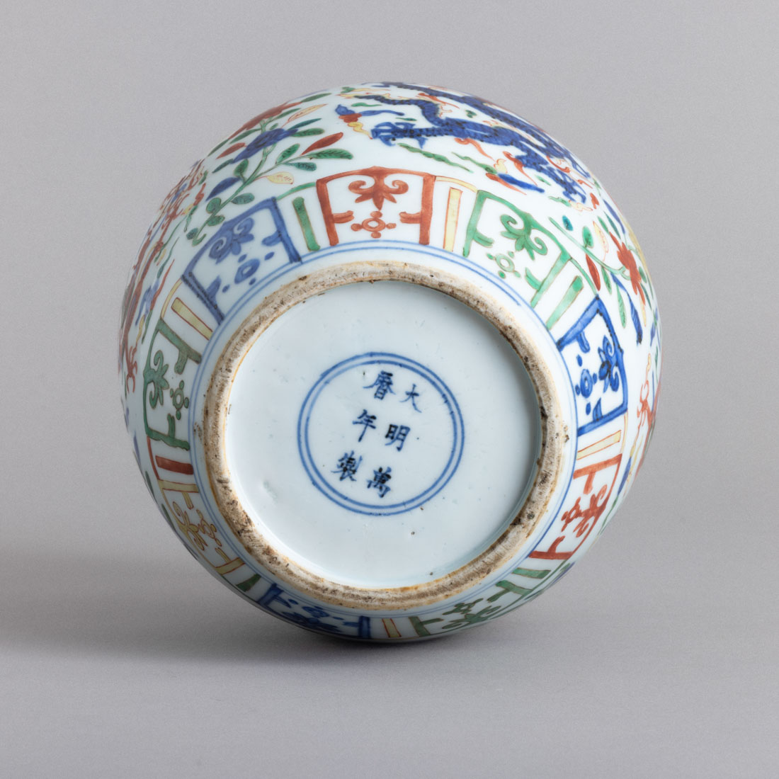 Em porcelana da China, decoração policromada "flores, motivos vegetalistas, enrolamentos e dragões". Marcada. Sinais de uso.