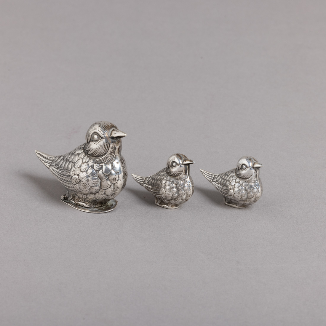 Esculturas em prata portuguesa contraste águia (1938-1984) de 833 e (pós 1985) de 925, dois marcados Topázio, decoração relevada. Um sem marcas, ao abrigo do Decreto-Lei n.º 120/2017. Sinais de uso e o maior com pequenas amolgadelas. Peso aprox.: 39 g. Dim.: 4,5 e 7 cm.