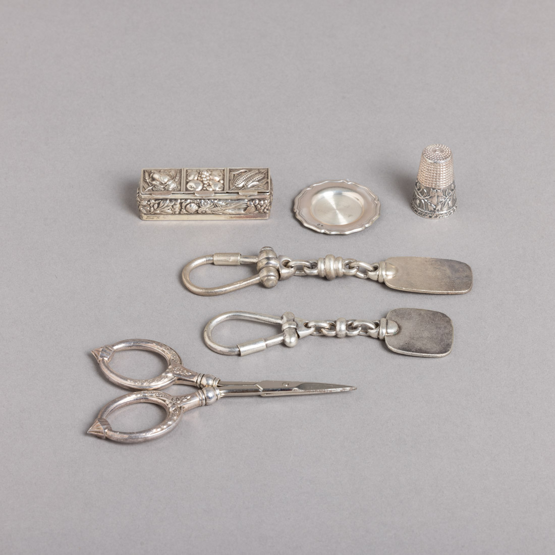 Em prata portuguesa contraste águia (pós 1985) de 835 e 925, decoração diversa, dedal e tesoura sem marcas, ao abrigo do Decreto-Lei n.º 120/2017. Sinais de uso e pequenas amolgadelas.