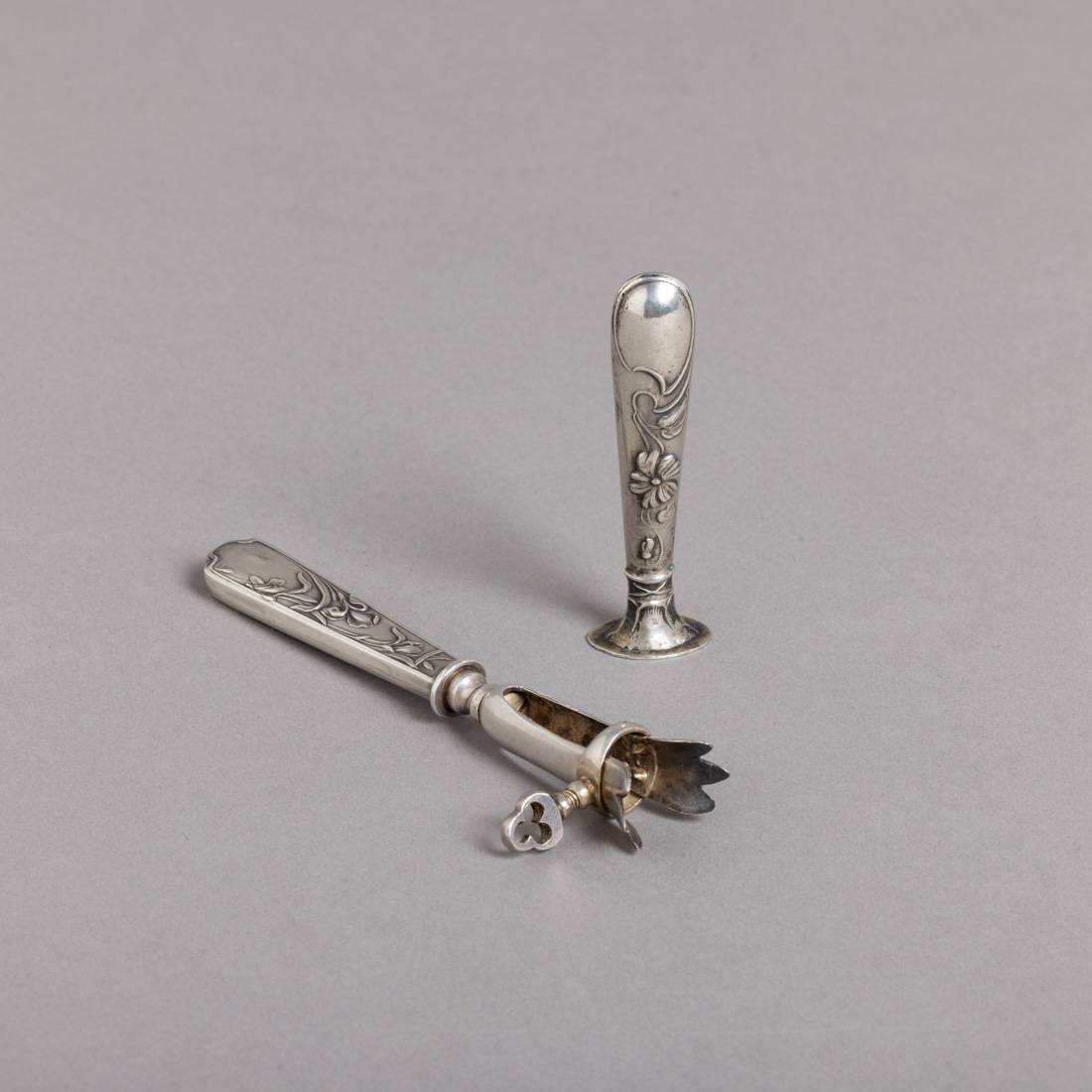 Manche a gigot com cabo em prata francesa de 925, marca de garantia de teor e sinete em prata portuguesa contraste javali (1887-1937) de 833, decoração relevada "flores". Sem marcas portuguesas, ao abrigo do Decreto-Lei n.º 120/2017. Sinais de uso e levesamolgadelas. Peso total aprox.: 33 g. Dim.: 11,5 e 7 cm.