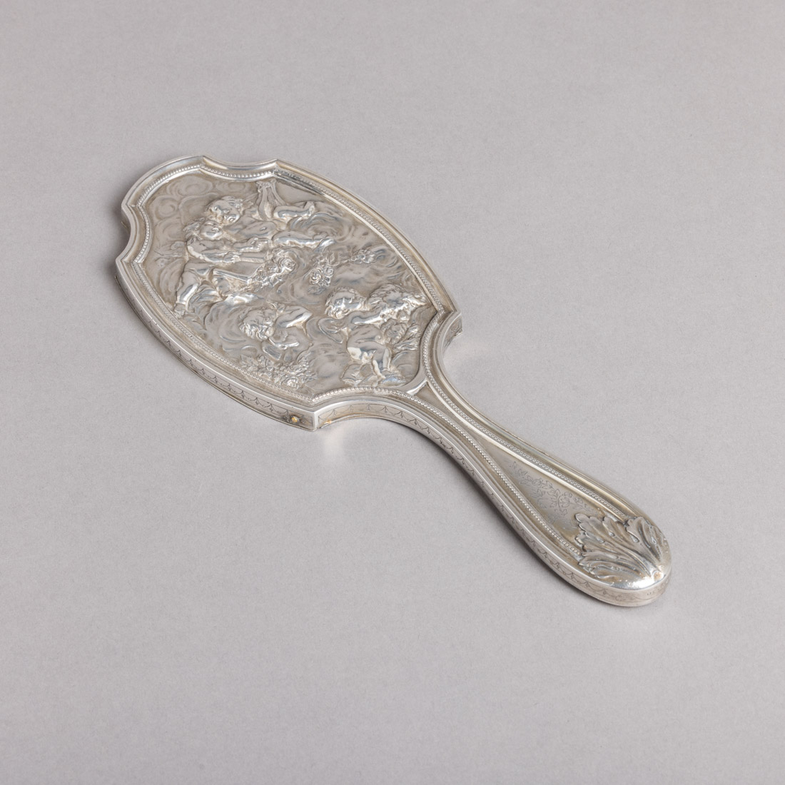 Em prata portuguesa contraste javali (1887-1937) de 833, decoração relevada e gravada "elementos vegetalistas e Putti", friso de perlados. Sinais de uso e pequenos defeitos no espelho.