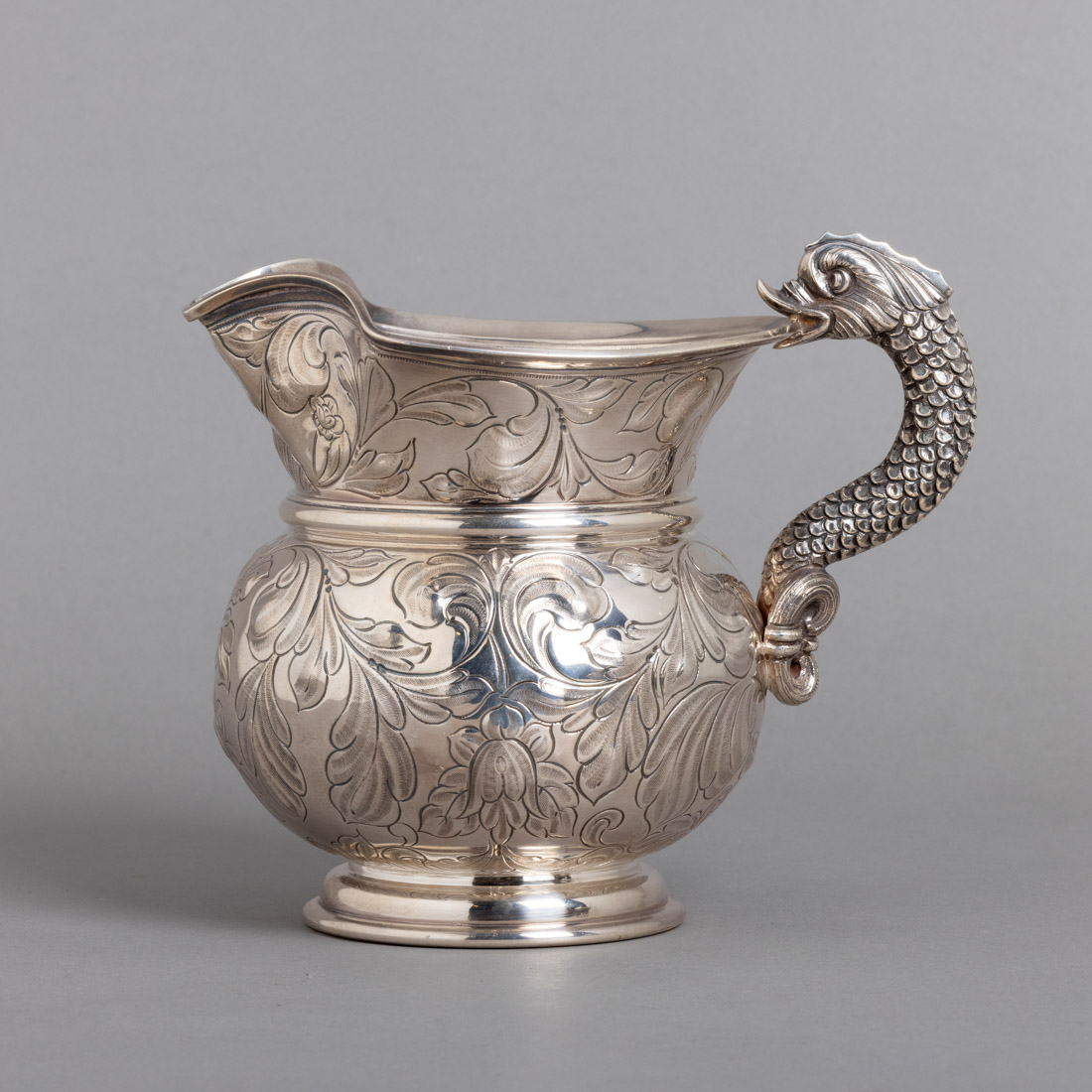 Em prata portuguesa contraste águia (pós 1985) de 925, decoração relevada e gravada "elementos vegetalistas", pega na forma de golfinho
