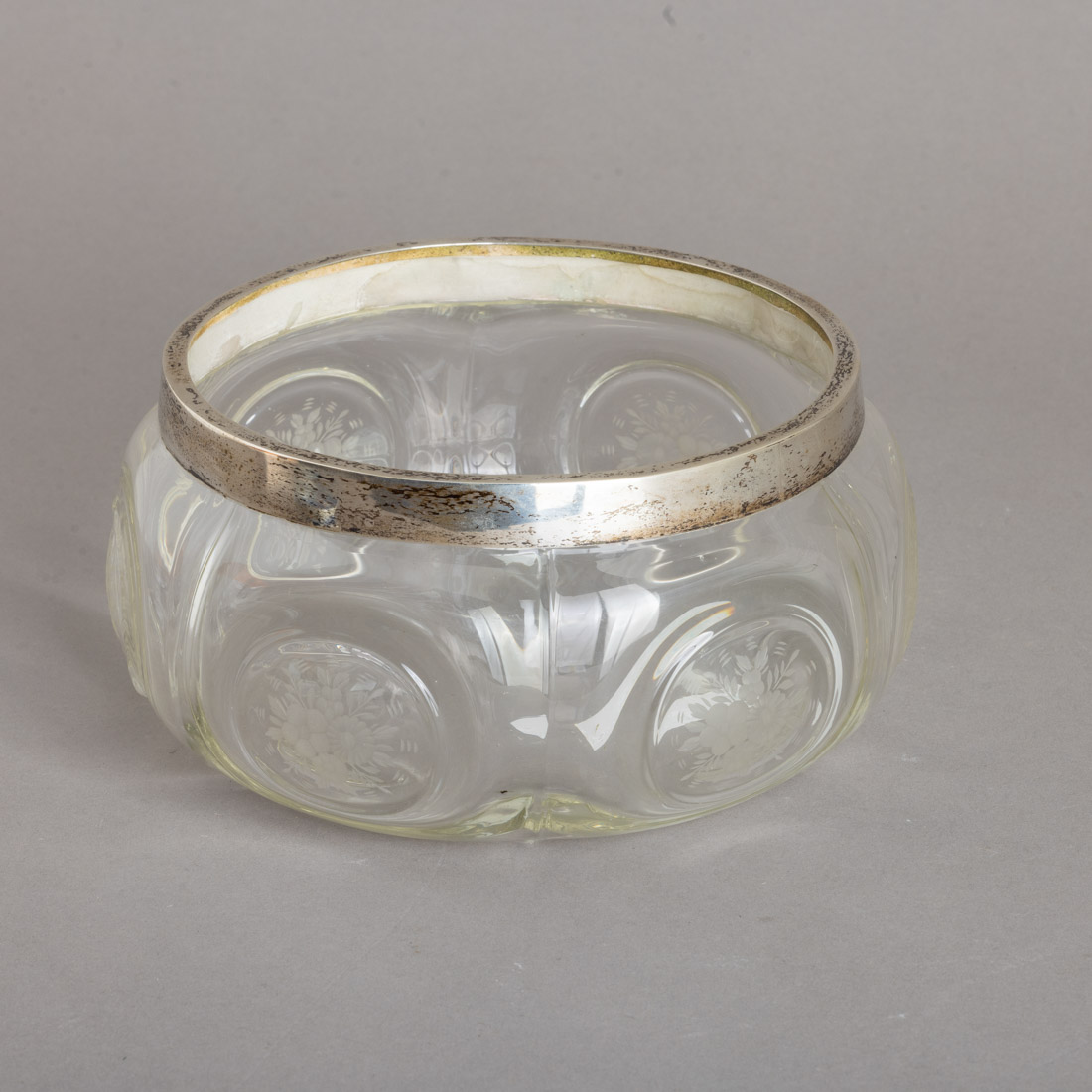 Em cristal moldado e gravado "flores", aro em prata portuguesa contraste javali (1887-1937) de 833. Sinais de uso.