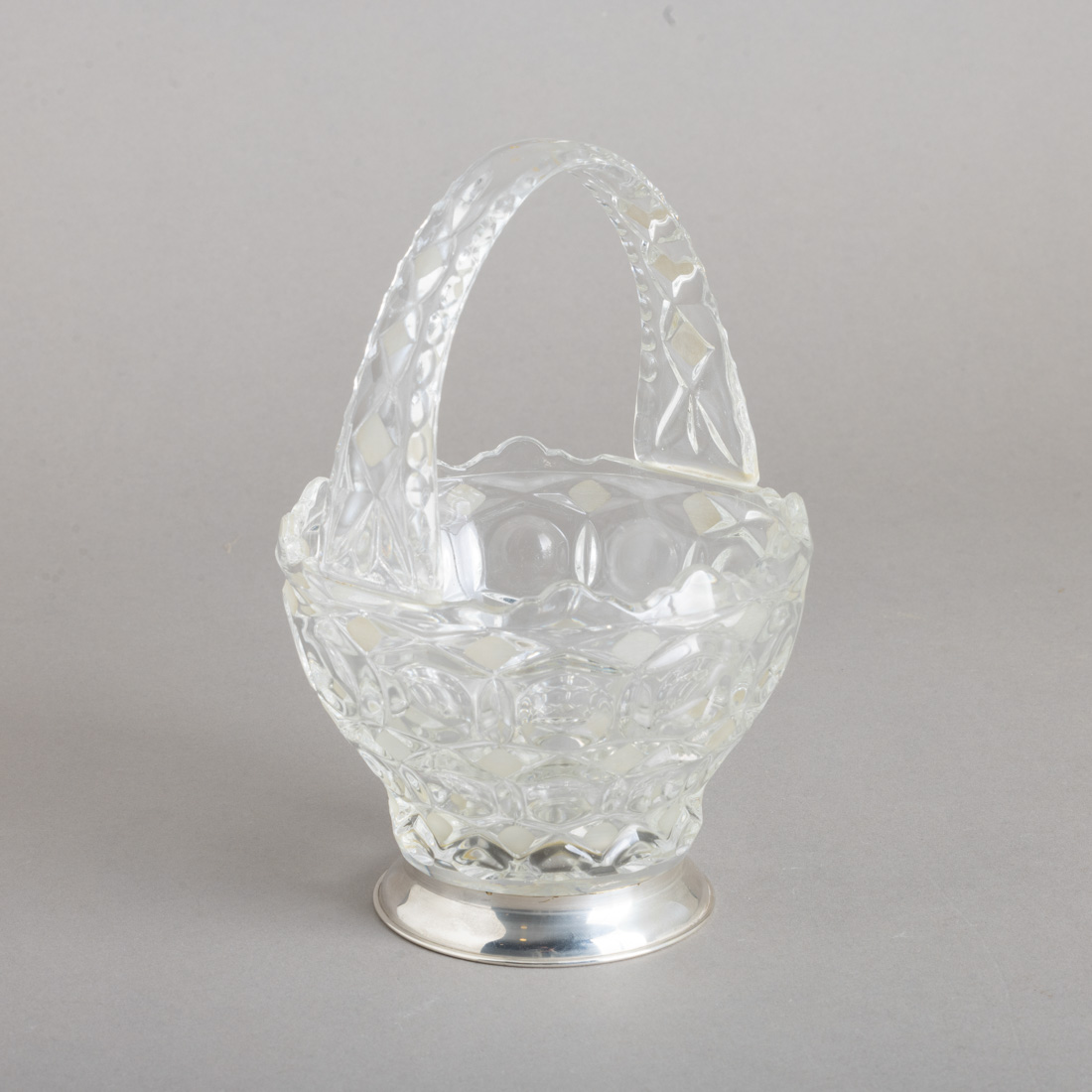Em vidro decoração relevada, base com aro em prata espanhola de 915 marcas de garantia de teor (pós 1934), decoração lisa. Sem marcas portuguesas, ao abrigo do Decreto-Lei n.º 120/2017. Sinais de uso.