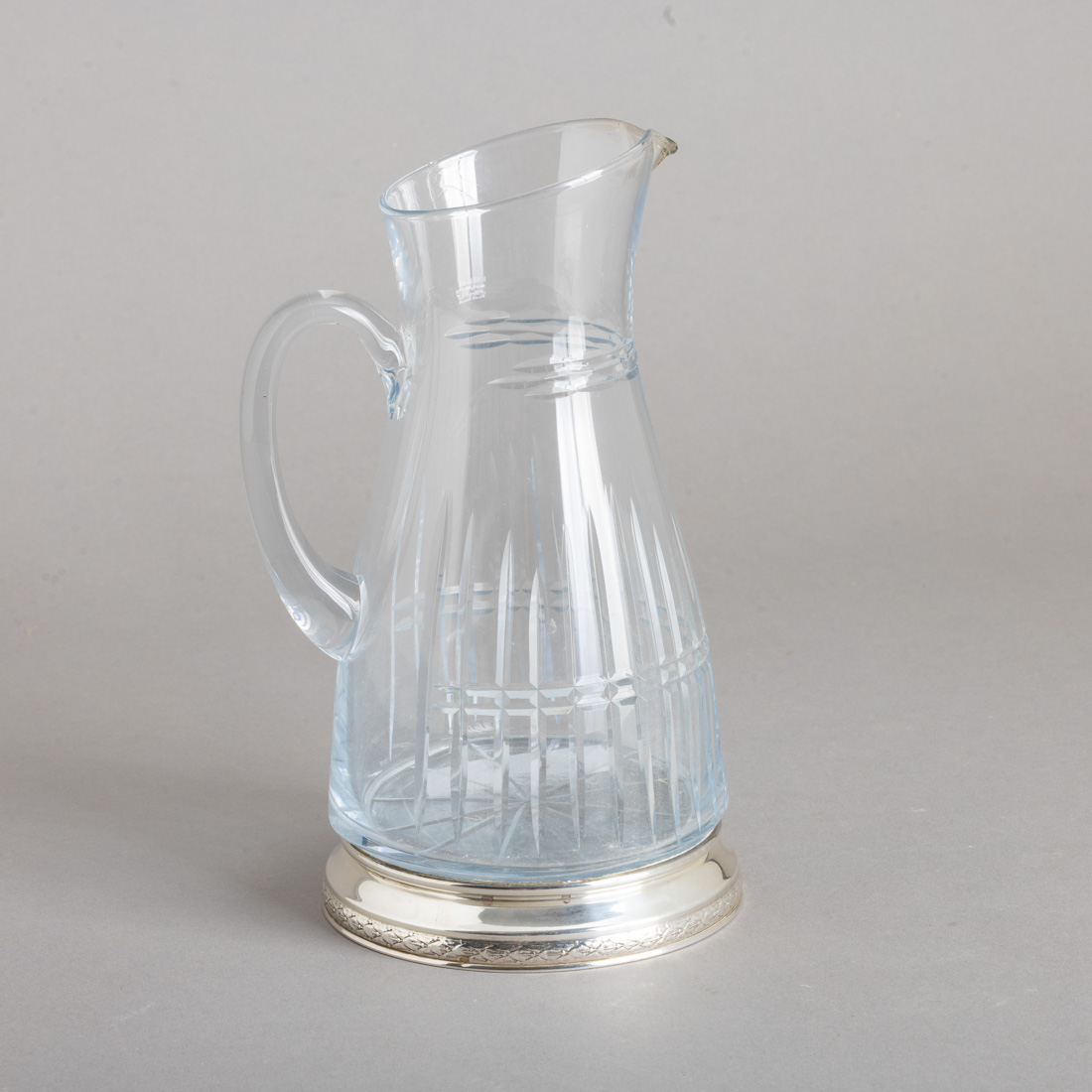 Em vidro moldado e lapidado, base com aro em prata espanhola de 915 marcas de garantia de teor (pós 1934), decoração relevada. Sem marcas portuguesas, ao abrigo do Decreto-Lei n.º 120/2017. Sinais de uso.