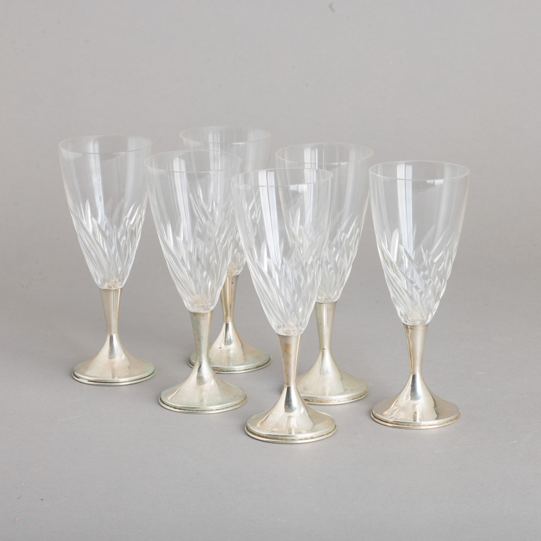 Em cristal decoração espiralada, base em prata espanhola marcas de garantia de teor, decoração lisa. Sem marcas portuguesas, ao abrigo do Decreto-Lei n.º 120/2017. Sinais de uso.