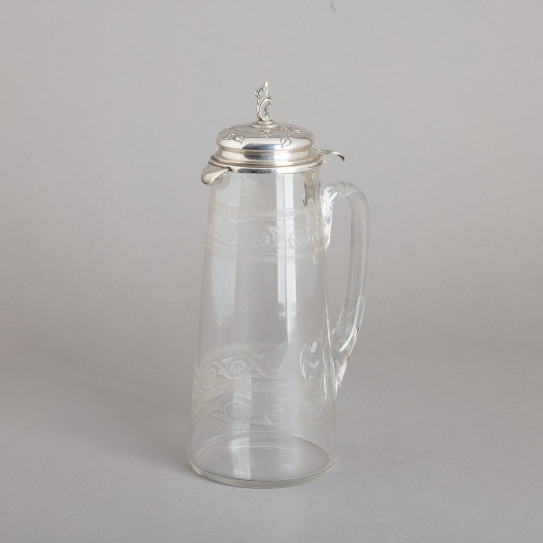Em cristal, decoração gravada com elementos vegetalistas, tampa em prata portuguesa contraste javali (1887-1937) de 833, decoração relevada com folhagem, monogramada. Sinais de uso e pequeno cabelo junto à pega. Peso aprox.: 56,4 g. (só prata) Dim: 30 cm.