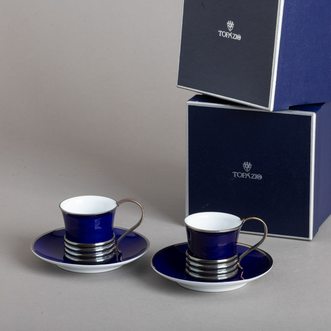Em porcelana marcada Neoclássica/Topazio montagem em prata portuguesa contraste águia (pós 1985) de 925, decoração a azul e prateado. Com caixa. Sinais de uso.