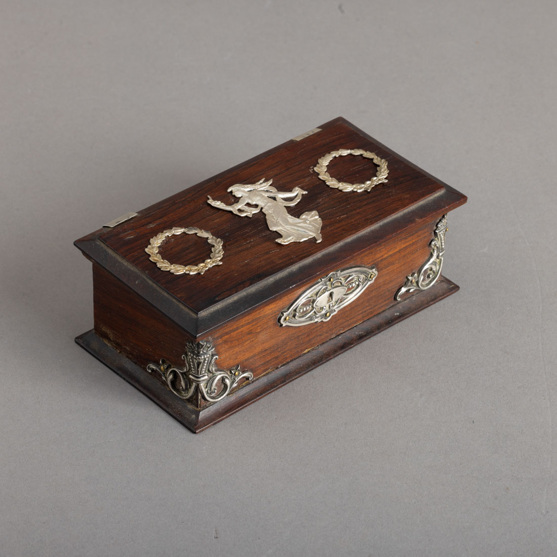Em pau santo com aplicações em prata portuguesa contraste javali (1887-1937) de 833, decoração relevada. Pequenas falhas e pequenos defeitos.