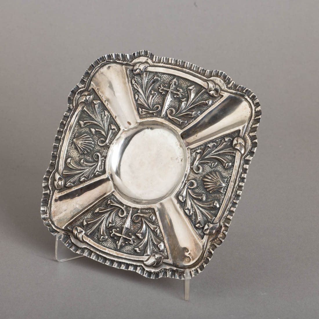 Em prata espanhola de 915 marcas de garantia de teor (pós 1934), decoração relevada com simbologia de Santiago. Sem marcas portuguesas, ao abrigo do Decreto-Lei n.º 120/2017. Sinais de uso.