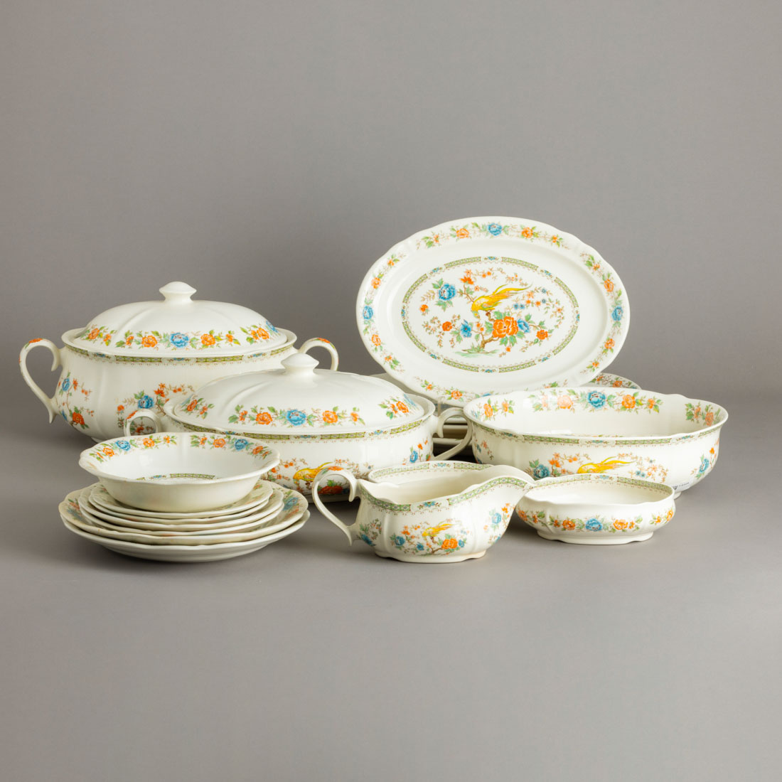 Em loiça pó de pedra da Fábrica de Loiça de Sacavém, decoração policromada "flores e pássaro" Composto por 24 pratos rasos, 12 fundos, 12 de sobremesa, 12 de doce, 4 travessas, 2 terrinas, taça, molheira e 2 conserveiras. Sinais de uso, craquelé.