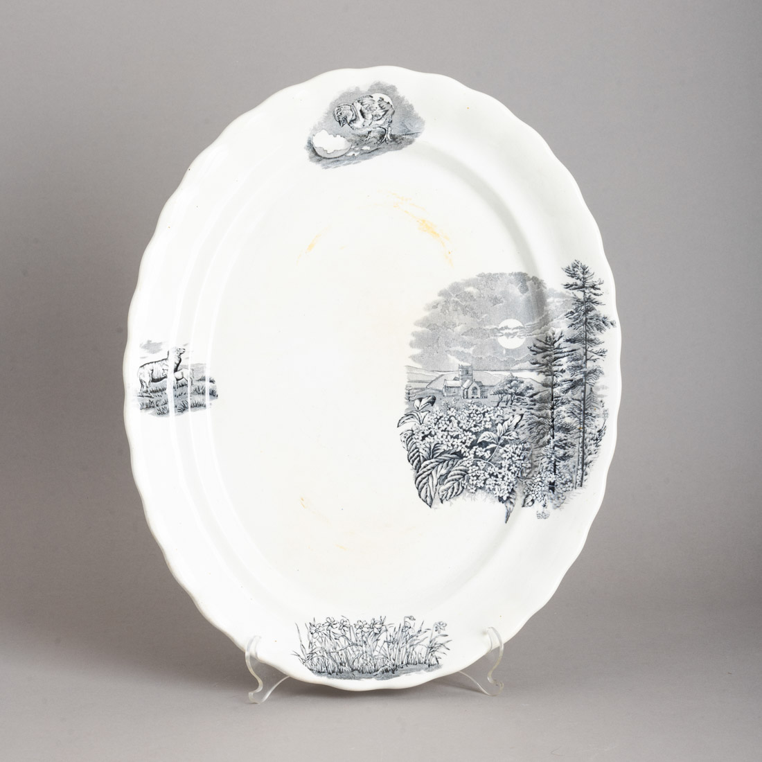 Em loiça pó de pedra da Real Fábrica de Sacavém, decoração a negro com elementos campestres. Sinais de uso, craquelé.